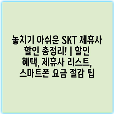 놓치기 아쉬운 SKT 제휴사 할인 총정리! SKT를 이용하시는 분들에게는 여러 제휴사 할인 혜택이 있습니다. 각종 쇼핑몰, 카페, 영화관 등에서 제공하는 다양한 할인으로 스마트폰 요금 절감이